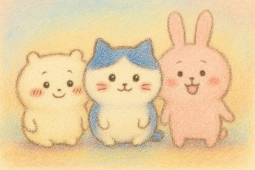 こんばんは。今日はカープはサヨナラ負け。敗因はよくわかっているけど、見つめ直したくないので、話題を最近ハマっているスマホのゲームにします。ChatGPTに「ちいかわ風のイラストをお願い」と言ったら、「『ちいかわ風』の雰囲気(まるっとしたフォルム、やさしい表情など)をもとにしたオリジナルの3キャラを、パステル画風で描いてみましょうか?」ということで、これを描いてくれました。