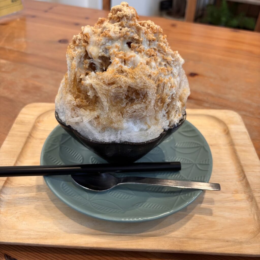 お目当ては、夏限定のかき氷。「黒糖きなこ」は、ふわっふわの氷にたっぷりのきなこと黒糖がかかっていて、口に入れた瞬間すっと溶けます。冷たさと優しい甘さに、暑さでくたびれた体が一気に癒されました。