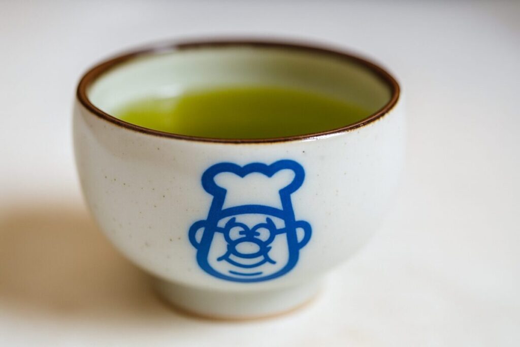 さらに、頼めばお茶のサービスも!(おぐらキャラ入り湯呑みがかわいい)濃くしっかりとしたお茶で食後の口の中もさっぱりします。