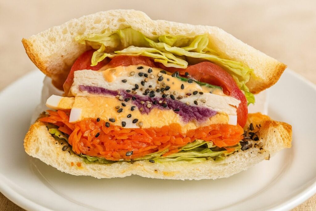 野菜サンドは、キャロットラペに紫たまねぎ、卵、トマトに自家製サラダチキン、チーズに塩揉みきゅうり、それをレタスで挟み込む、というようにひとつのサンドの中に何層もの味わいがあって、ずっと噛んでいたいくらいの満足感。