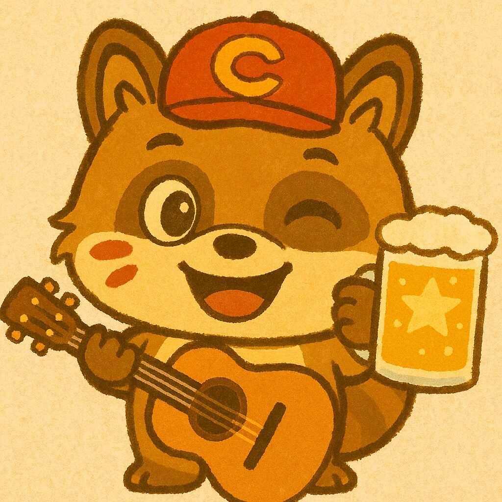今回は奥田さんをイメージして、たぬきがビールとギターを持っています。